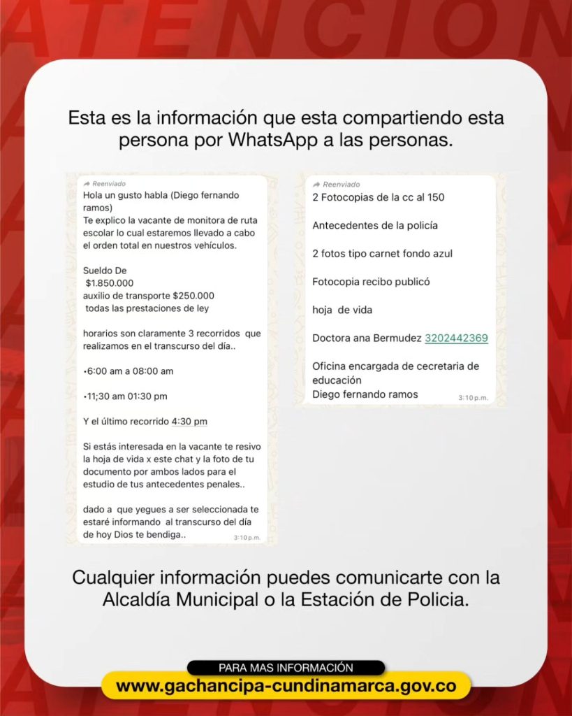 La Alcaldía Municipal de Gachancipá, en articulación con la Secretaría de Educación, Cultura, Recreación y Deporte de Gachancipá, emitió una alerta a la comunidad para prevenir que los ciudadanos sean víctimas de falsas ofertas de empleo que se están difundiendo a través de redes sociales y aplicaciones de mensajería.