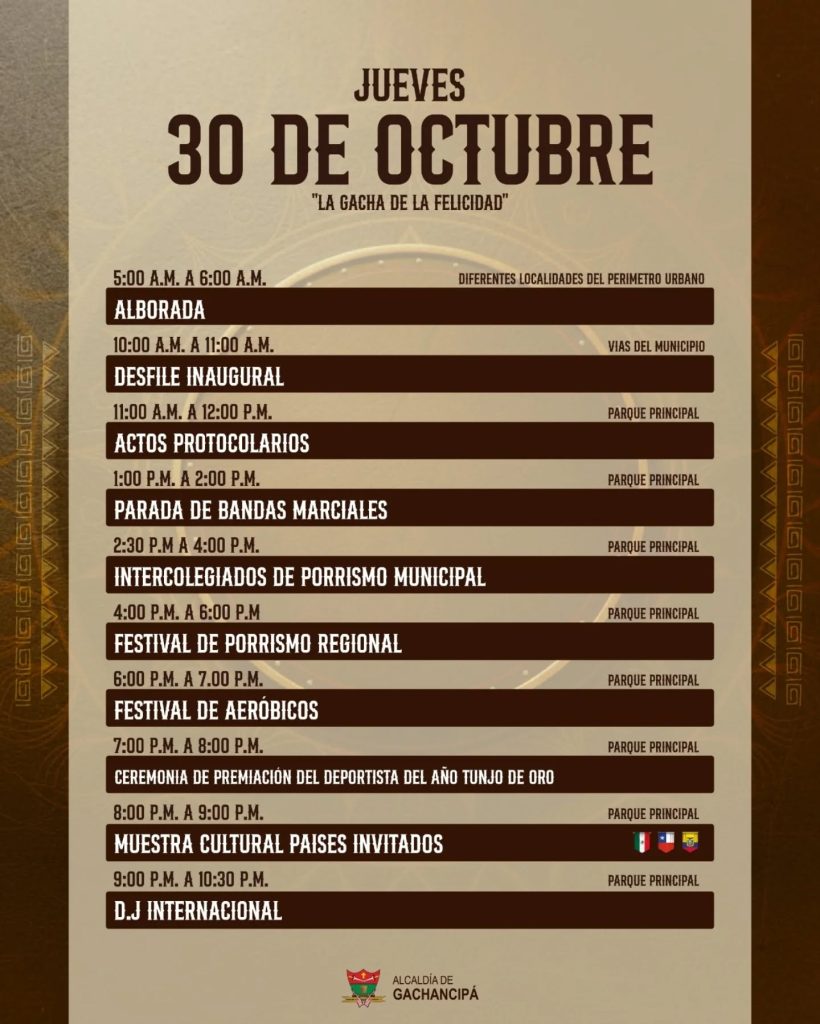 La Alcaldía Municipal de Gachancipá, liderada por el alcalde Alfonso López Sánchez, y la Secretaría de Educación, Cultura, Recreación y Deporte anunciaron la programación oficial de la XXX Semana Cultural Internacional de Gachancipá, un evento que conmemora tres décadas de historia, arte y tradición.