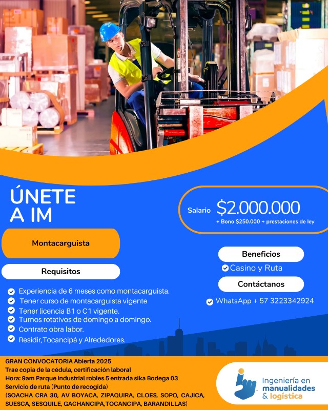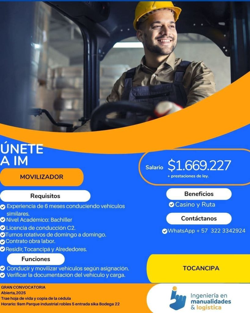 Para los cargos de Movilizador y Montacarguista, la convocatoria presencial se realizará el martes 21 de octubre de 2025 a las 9:00 a. m. en el Parque Industrial Robles, con ingreso por la Bodega 22 (Sika) para Movilizadores y la Bodega 03 (Sika) para Montacarguistas.