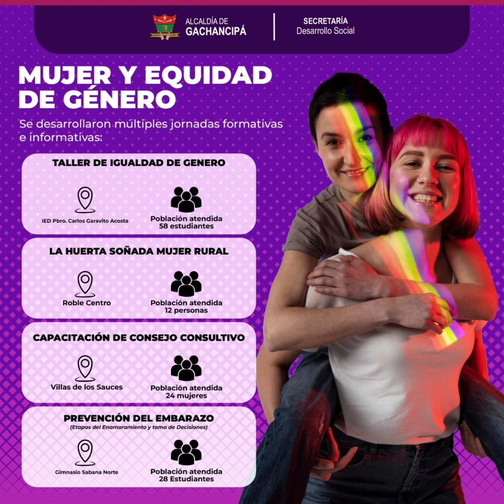 En materia de mujer y equidad de género, se adelantaron talleres de igualdad, actividades como “La Huerta Soñada”, capacitaciones en Villa de los Sauces y jornadas de prevención del embarazo en instituciones educativas, impactando a más de 120 personas.