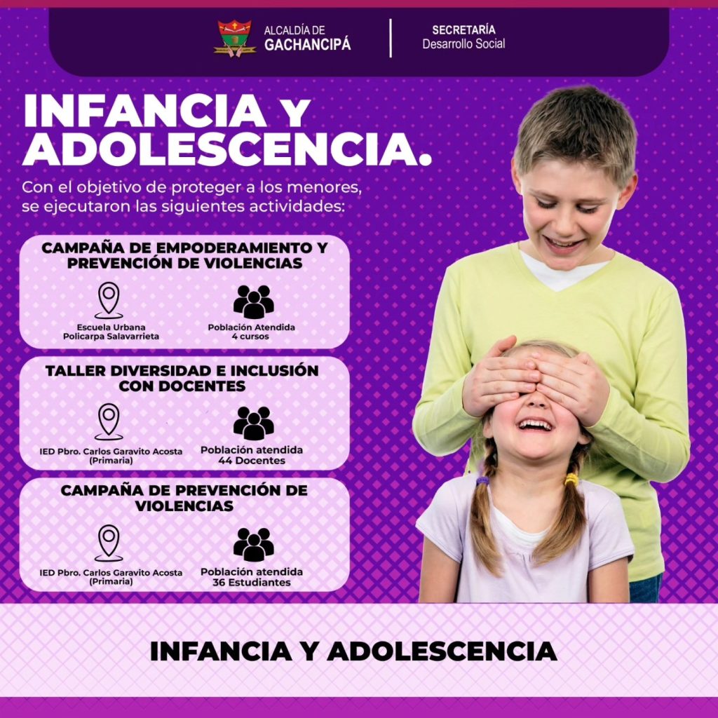 Respecto a infancia y adolescencia, se desarrollaron procesos pedagógicos en cuatro cursos de la Escuela Policarpa Salavarrieta, capacitaciones a 44 docentes en inclusión y actividades de sensibilización con estudiantes de la IED Presbítero Carlos Garavito Acosta, orientadas a la prevención de la violencia.