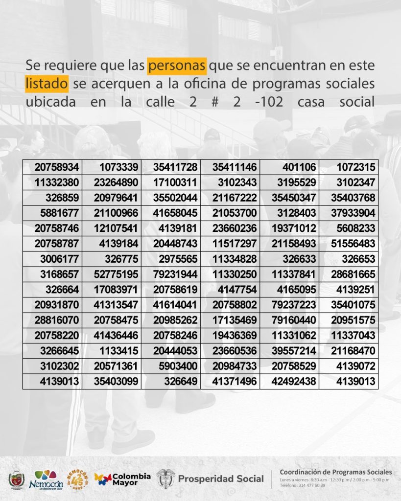 Las personas cuyos números de cédula aparecen en el listado deben acercarse a la Oficina de Programas Sociales, ubicada en la Calle 2 # 2-102 (Casa Social), presentando la cédula original y una fotocopia.