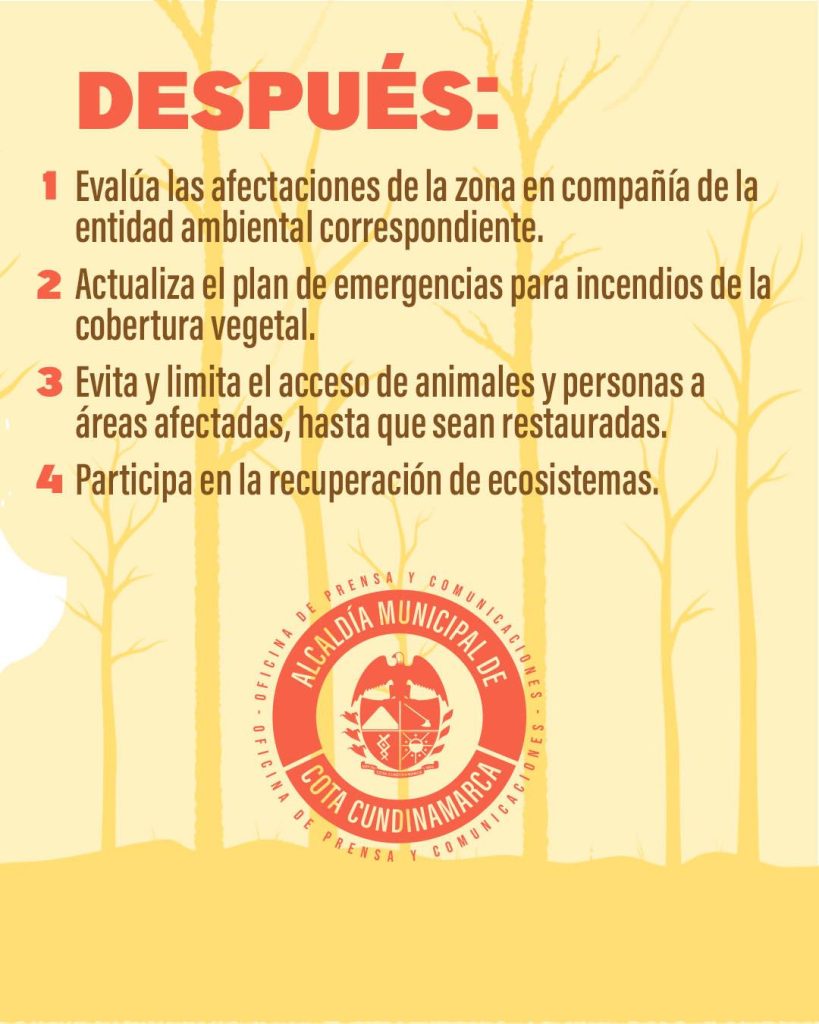 La prevención de las emergencias forestales es una responsabilidad compartida. Por ello, se invita a la comunidad a seguir las recomendaciones establecidas para actuar de manera segura y oportuna ante este tipo de situaciones, contribuyendo así a la protección del entorno natural y la seguridad de todos.