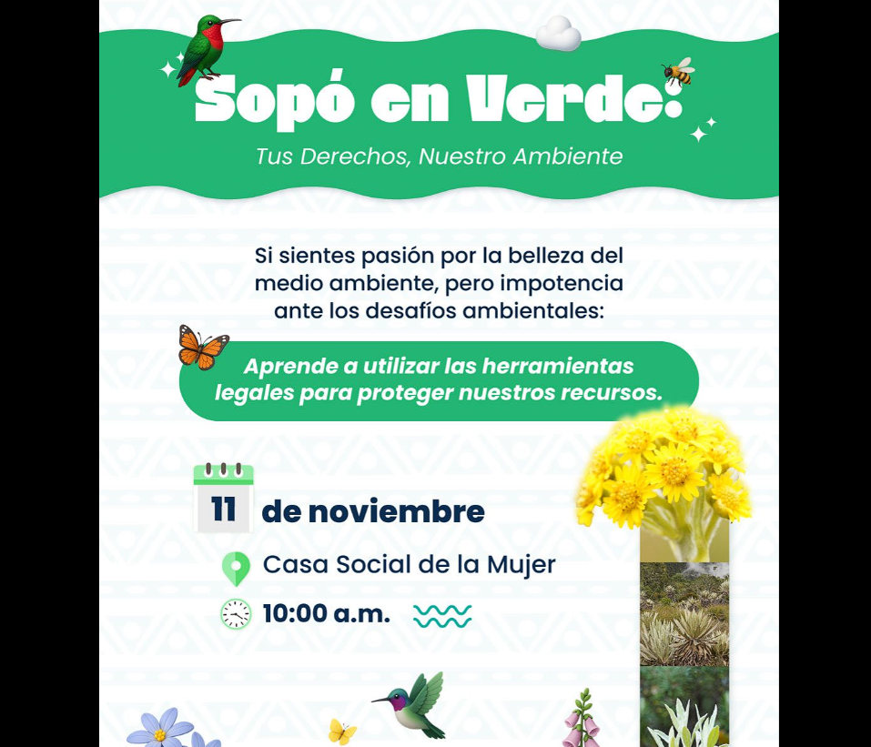 Posteriormente, a las 10:00 a.m., se desarrollará la charla “Sopó en Verde: Tus Derechos, Nuestro Ambiente”, un espacio orientado a quienes desean proteger el medio ambiente y aprender a utilizar mecanismos legales para la defensa de los recursos naturales.