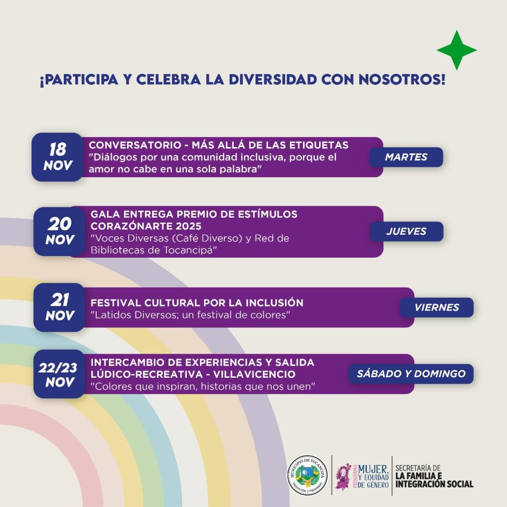 La Administración Municipal invita a toda la ciudadanía a participar activamente en esta agenda, reafirmando su compromiso con la construcción de una Tocancipá más inclusiva y orgullosa de su diversidad.